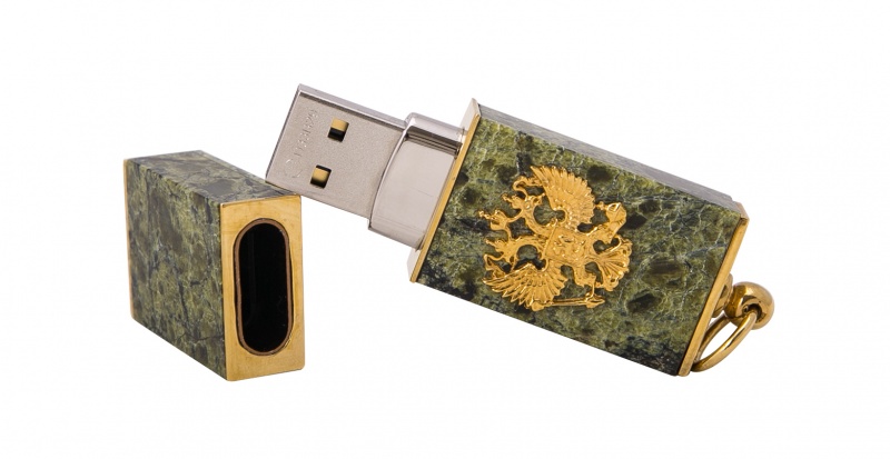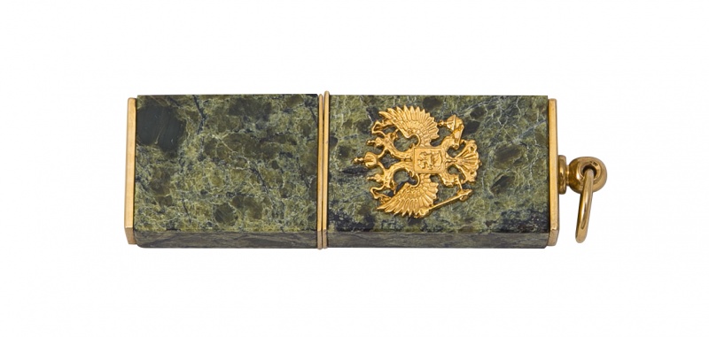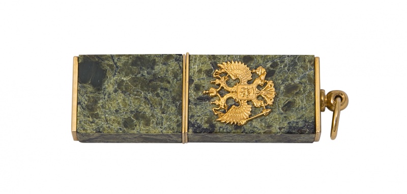 Сувенир "флешка". Материал: латунь, змеевик. Покрытие: золотом 999,9; никелем. Техника исполнения: токарные и слесарные работы, художественное литье. Настоящим оригинальным и ультрасовременным подарком для директора или партнера по бизнесу станет сувенир «Флешка». Она покрыта золотом и никелем и выполнена из латуни и натурального камня - змеевик. Флешка украшена золотым гербом Российской Федерации, что придает ей изысканности и эксклюзивности. Такой сувенир прекрасно впишется в деловой интерьер и выгодно подчеркнет статус в обществе ее обладателя. Покрытие Гальванический метод