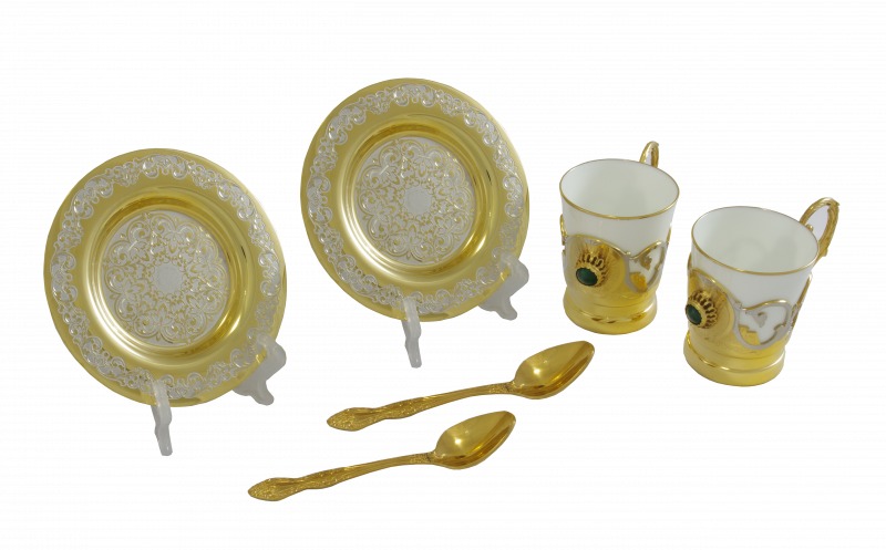 Набор кофейный с малахитом ( 2 тарели, 2 чашки, 2 ложки) златоуст