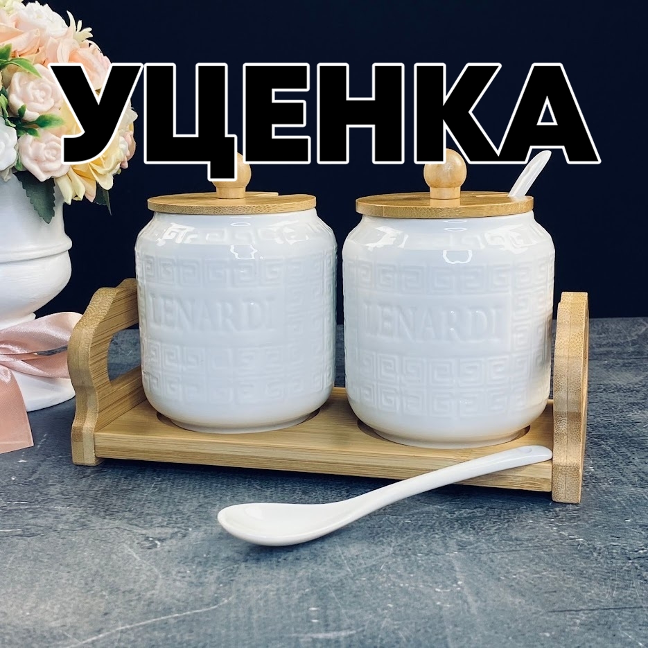 Уценка 1 шт из набор из 2 банок 350мл для специй с ложками на подставке Bamboo в под.уп. фарфор