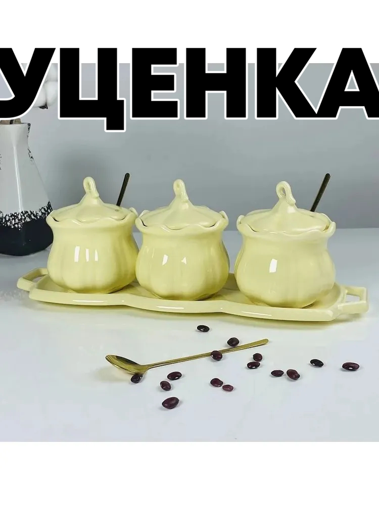 Уценка 1 шт из набор для сыпучих продуктов 4 предмета банки 250мл, ложки, подставка, фарфор