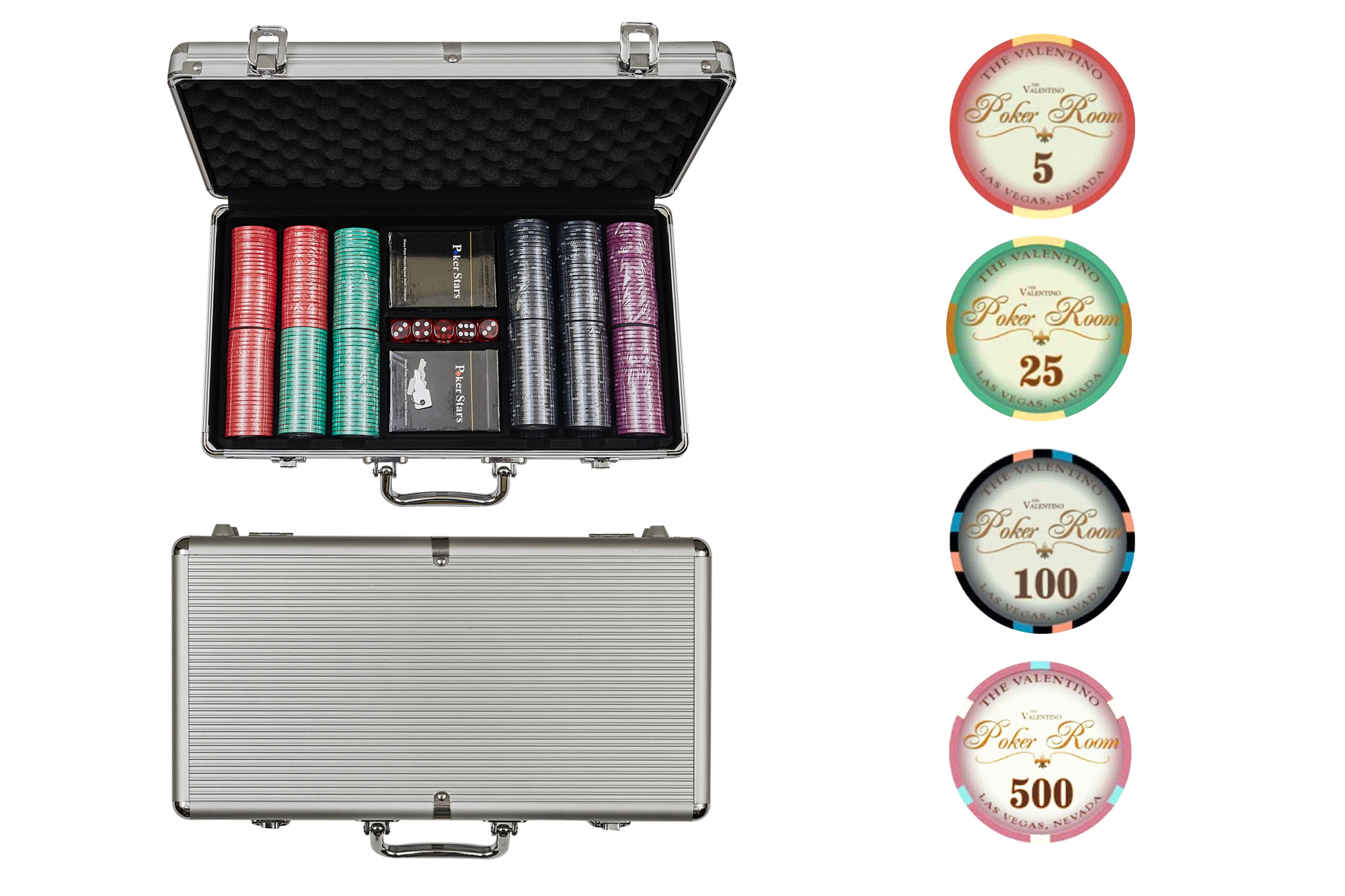 Набор для покера valentino на 300 фишек. Модель: Набор для покера Poker Room на 300 фишек Номинал фишек: 5-75шт, 25-75шт, 100-100шт, 500-50шт. Сумма номиналов: 37250 Карты: 2 колоды Кости: 5 Дополнительно: фишка дилера Размер (см): 39/23/7 Размер в упаковке (см): 40.5/23.3/7.5 Вес (кг): 4.55 Упаковка: Полиграфическая Производитель: Partida Страна производитель: Китай