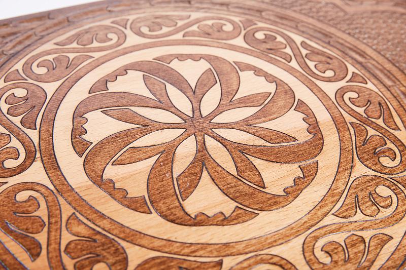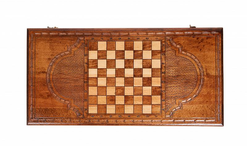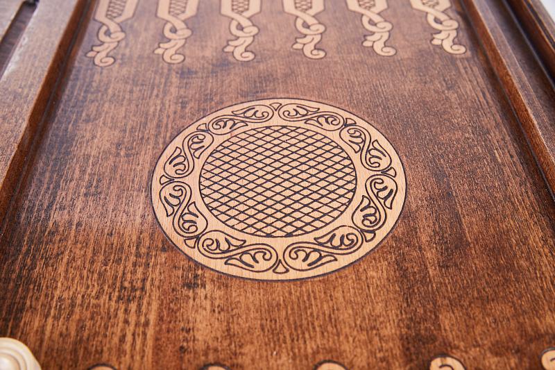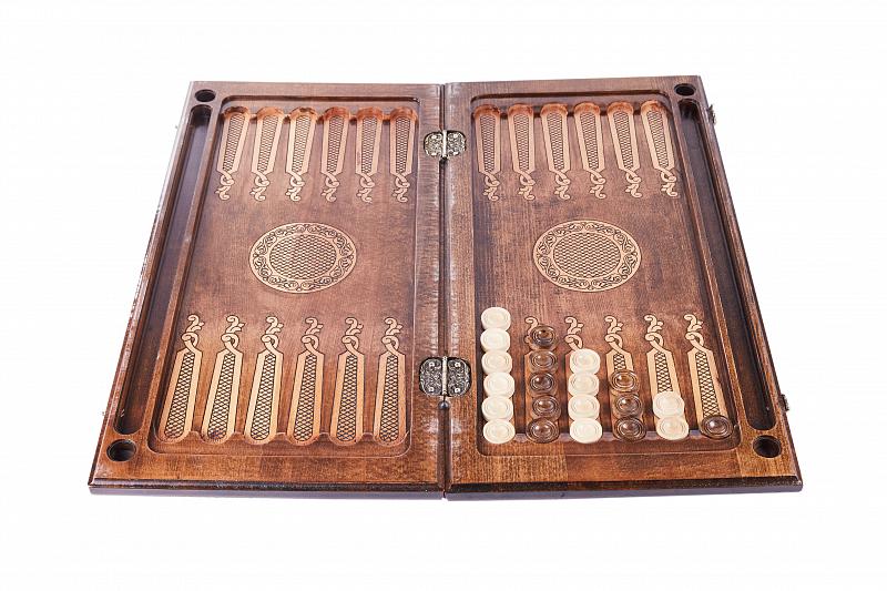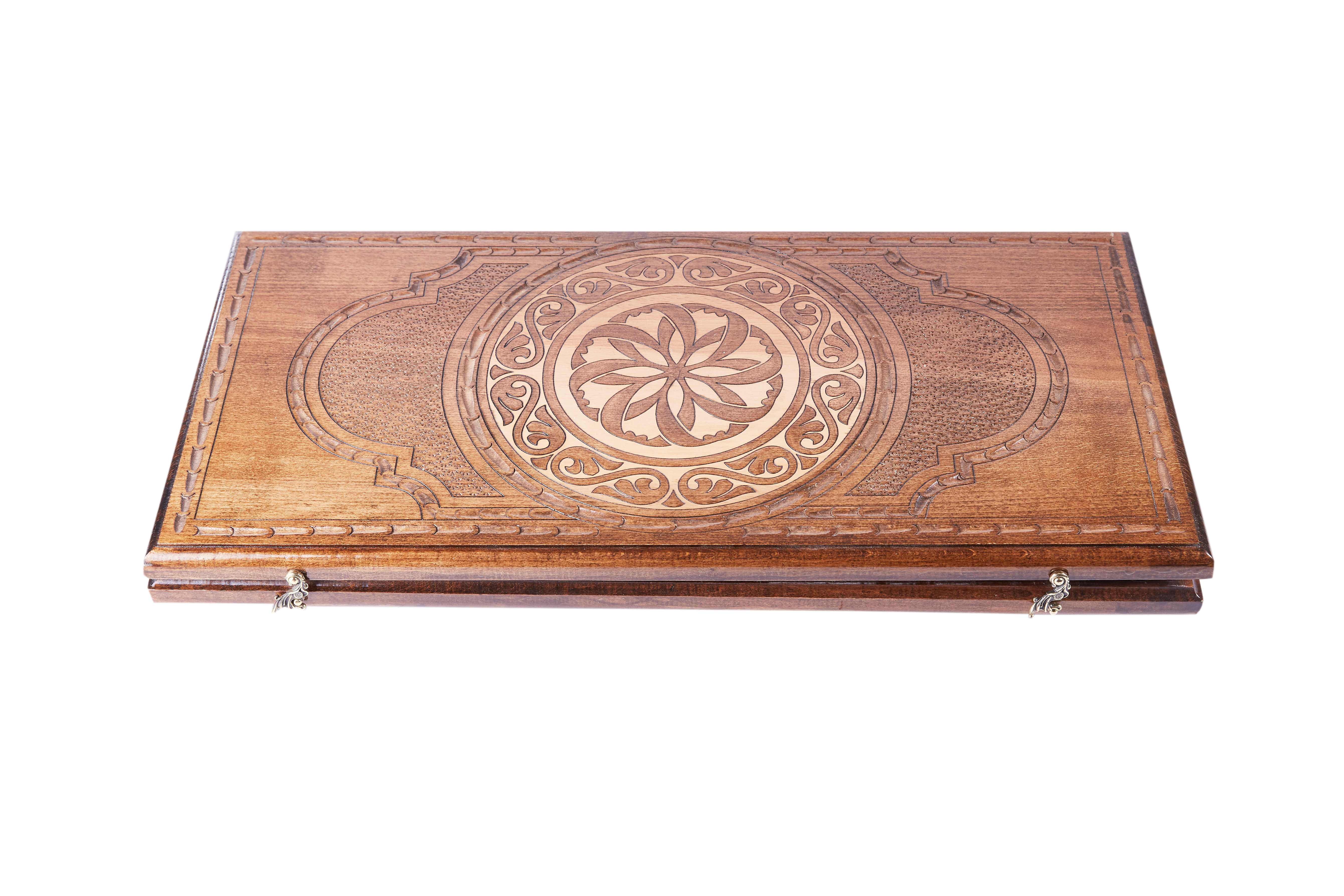 Нарды резные майрамут 4 60, zakaryan. Когда хочется порадовать себя или нужен хороший подарок другу, то стоит купить нарды резные «Майрамут 4» от известного мастера из Армении Вартана Закаряна. За их прочность отвечает цельный массив бука, который способен прослужить десятки лет и сохранит свой внешний вид. Петли и крючки сделаны из настоящей бронзы, что позволяет не беспокоиться об их долговечности, даже если играть каждый день. Изысканность этого изделия видна уже при первом взгляде на лицевую сторону – загадочный радиальный узор, окружённый орнаментом, и всё это на фоне характерной древесной структуры. На задней части присутствует шашечное поле, также оформленное орнаментом. Даже петли мастер выполнил в собственном уникальном стиле и необычной форме. Для комфортной транспортировки предусмотрен тканевый чехол в комплекте.