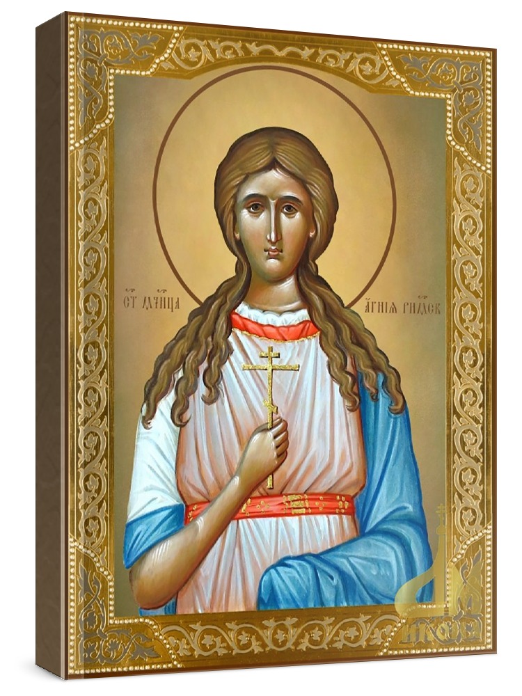 Икона агния римская. Агния Римская (291-304) - почитаемая христианская святая, канонизированная в лике мучеников. Агния Римская также упоминается под именами: Агнесса Римская, Агнеса Римская и Анна Римская. Согласно житию Агнии Римской, она происходила из знатной римской семьи и с раннего детства веровала в Христа, в связи с чем планировала провести жизнь соблюдая обет безбрачия. Сложилось так, что когда Агнии было около 14 лет, в неё влюбился властный сын римского префекта Семпрония (или Симфрония). Девушка отказалась выходить замуж, что разозлило префекта, также узнавшего, что Агния является христианкой. Следуя приказу Семпрония, языческие жрецы начали принуждать Агнию Римскую отречься от Христа и принести жертву языческим богам, в противном случае они угрожали отправить девушку в блудный дом... Агния Римская была непреклонна в своей вере, однако Господь не позволил язычникам поругать честь Агнии - только лишь язычники попытались обнажить её в публичном доме, как у неё на голове сразу отрасли длинные густые волосы, скрывшие тело святой от взоров нечестивцев. После этого чуда Агния была подвергнута жестоким пыткам, а затем убита ударом меча в гортань. Память мученица Агнии Римской празднуется дважды в год: 21 января по старому стилю (3 февраля по современному календарю) и 5 июля (18 июля).