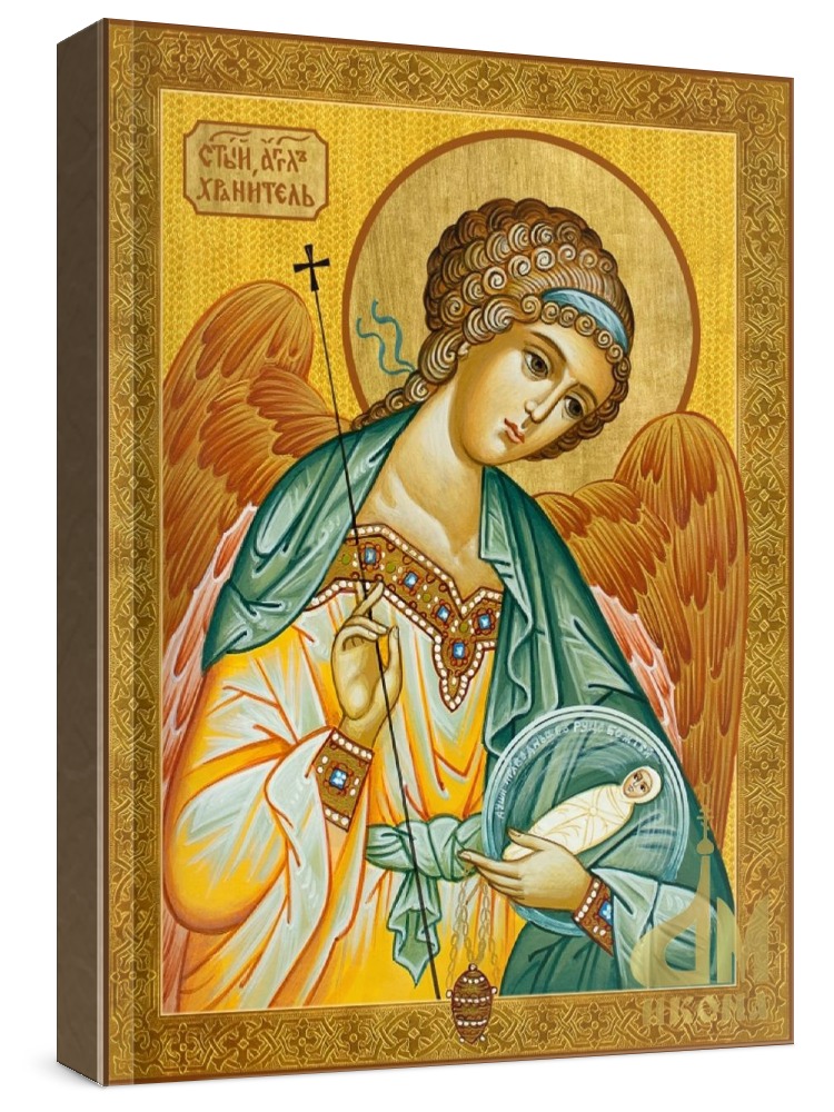 Икона ангел-хранитель с младенцем. Ангел-хранитель - это добрый небесный дух, исполняющий волю Божью и оберегающий вверенных ему людей от различных напастей. Ангел-хранитель не имеет физического воплощения и даже его личное имя сокрыто от подопечных, но, не смотря на это, Хранитель не перестаёт быть ближайшим духовным наставником для вверенного ему человека. Все свои силы Ангел-хранитель уделяет тому, чтобы уберечь человека от зла и наставить его на путь истинного благочестия. Небесная святость и благочестие Ангелов-хранителей ежегодно празднуется в составе Собора архистратига Михаила и прочих небесных сил бесплотных 8 ноября по старому стилю (21 ноября по новому стилю).