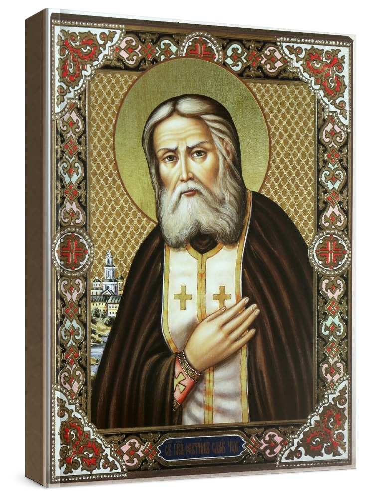 Икона серафим саровский. Святой преподобный Серафим Саровский (1754-1833) - почитаемый святой Русской православной церкви, канонизированный в 1903 году по инициативе Николая II, последнего императора Российской империи. Жизнеописание святого гласит, что на протяжении практически всей своей жизни он жил аскетом в затворничестве, практически всё своё время уделяя молитвами. В последние годы земной жизни он обрёл способности к чудотворству: лечил болезни молитвой и мог прозревать ближайшее будущее. Свои способности Серафим Саровский применял для помощи нуждающимся - каждый день он стремился принять как можно больше людей, для чего даже прекратил своё затворничество. Память Святого преподобного Серафима Саровского отмечается каждый год: 2 января по юлианскому календарю (15 января по григорианскому календарю) и 19 июля (1 августа).