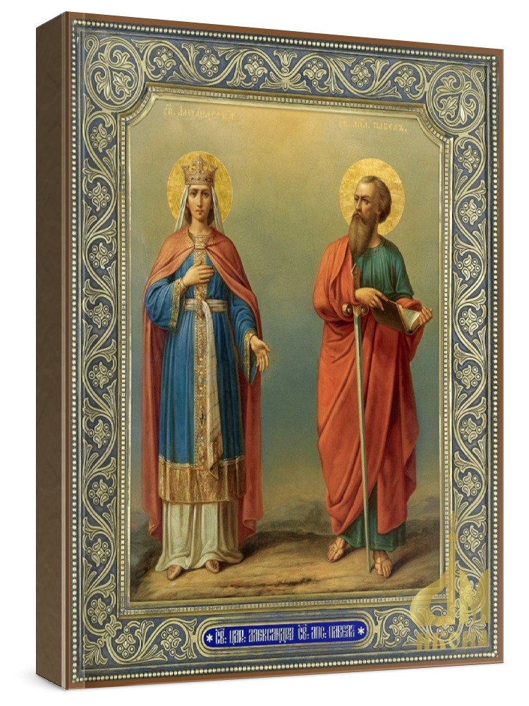 Икона святая царица александра и святой апостол павел. Совместный иконографический ростовой образ Святой царицы Александры и Святого апостола Павла. Святая царица Александра, также известная как Александра Римская - почитаемая христианская мученица, о которой известно из жизнеописания Георгия Победоносца. Царица Александра всегда сочувствовала гонимым христианам, но лично увидев мученичества Георгия Победоносца, императрица Александра открыто обратилась к христианству, за что была казнена по указу своего мужа, римского императора Диоклетиана. Святой апостол Павел, урождённый Саул или Савл - почитаемый апостол, сначала бывший фарисейским гонителем христиан, но затем и сам уверовавший в Христа, после увиденного чуда. Апостол Павел не входит в числа 12 и 70 апостолов. Память Святой царицы Александры празднуется 23 апреля по старому стилю (6 мая по новому стилю), а память Апостола Павла празднуют 29 июня (12 июля).