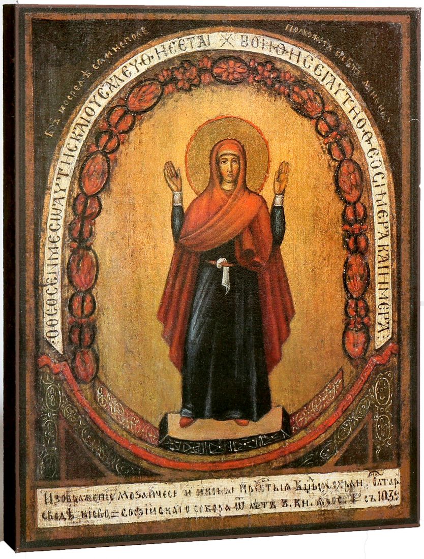 Икона нерушимая стена образ богородицы. Нерушимая стена - это знаменитый ростовой иконографический образ Божией Матери. Икона демонстрирует Пресвятую Богородицу, стоящей во весь свой рост на исполинском золотом камне-прямоугольнике. Руки Богородицы воздеты к небу в священной молитве. Иконографический образ был создан в давние времена на базе знаменитого мозаичного изображения Богородицы, расположенного в киевском Софийском соборе. Название образа (Нерушимая стена) обусловлено тем, что уже на протяжении множества столетий участок стены с мозаикой не подвергается значительному повреждения, даже в тех трагических случаях, когда в результате каких-либо неурядиц значительно страдает и рушится остальная часть собора. Праздник по богородичному образу Нерушимая стена переходящий - празднуется в воскресение Собора всех святых (Неделя всех святых).