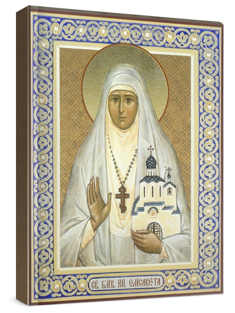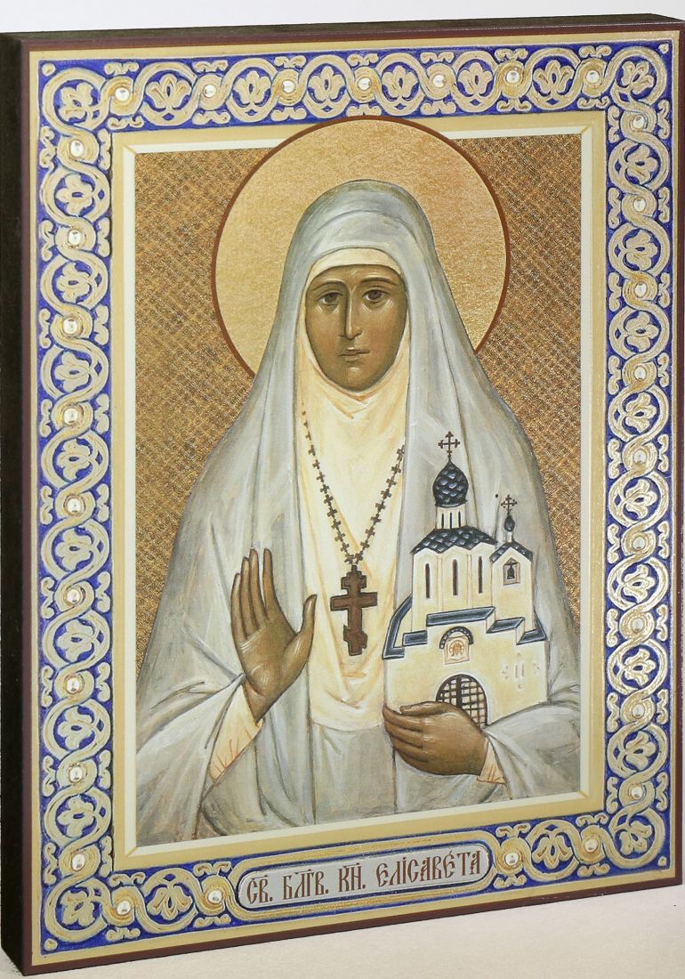 Икона елизавета феодоровна. Святая благоверная княгиня Елизавета (Елисавета) (1864-1918) - это почитаемая православная святая в лике новомучеников, была канонизирована Русской православной церковью в 1992 году. В 1909 году Великая княгиня основала в Москве Марфо-Мариинскую обитель милосердия на Большой Ордынке - ныне обитель находится в статусе ставропигиального женского монастыря. Елизавета Фёдоровна активно занималась подвижничеством - безвозмездно ухаживала за больными, читала молитвы над телами умерших, всячески помогала московским сиротам и нищим. Великая княгиня была убита большевиками 18 июля 1918 года в возрасте 53 лет. Вместе со своими соратниками и родственниками Елизавета Фёдоровна была живьём сброшена в вертикальный ход шахты Новая Селимская, что недалеко от города Алапаевск. Память святой Елизаветы празднуется в день её смерти - 5 июля по юлианскому календарю (18 июля по современному).