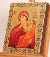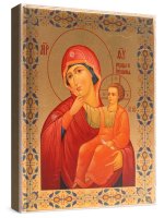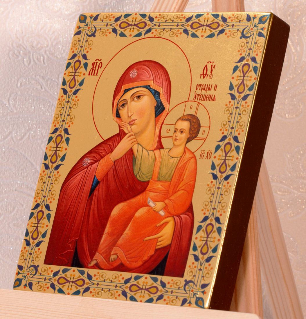 Отрада или утешение икона божией матери. На предварительно обработанную, специально подготовленную липовую доску наносится золочение. Далее методом прямой печати на золотую поталь (высокотехнологичный аналог сусального золота) переносится святой образ. Затем икона покрывается несколькими слоями защитного UV-лака, что защищает изображение от воздействий окружающей среды и выцветания красок (Гарантия - 50 лет!) На обратной стороне иконы имеется крепление и сертификат на изделие. Высокотехнологичное современное оборудование, используемое при производстве и применение итальянских красок премиум-класса делает качество иконы практически неотличимым от рукописного аналога. Преимуществом данной серии является так же и то, что никакие погрешности в изображении образа технологически невозможны - Вы получаете именно такую икону, которую видите на фотографии! Дополнительные характеристики икон в зависимости от размера (см): 13х16 - без ковчега, толщина доски 2 см. 17х21, 24х30 - с ковчегом (по желанию без), толщина доски 2 см. 30х40, 40х60, 60х80, 80х120 - с ковчегом (по желанию без), толщина доски 4 см, шпонки типа ласточкин хвост. Вожможно изготовление иконы по индивидуальному размеру и по индивидуальному изображению.