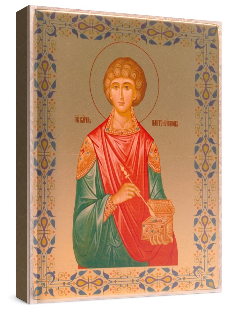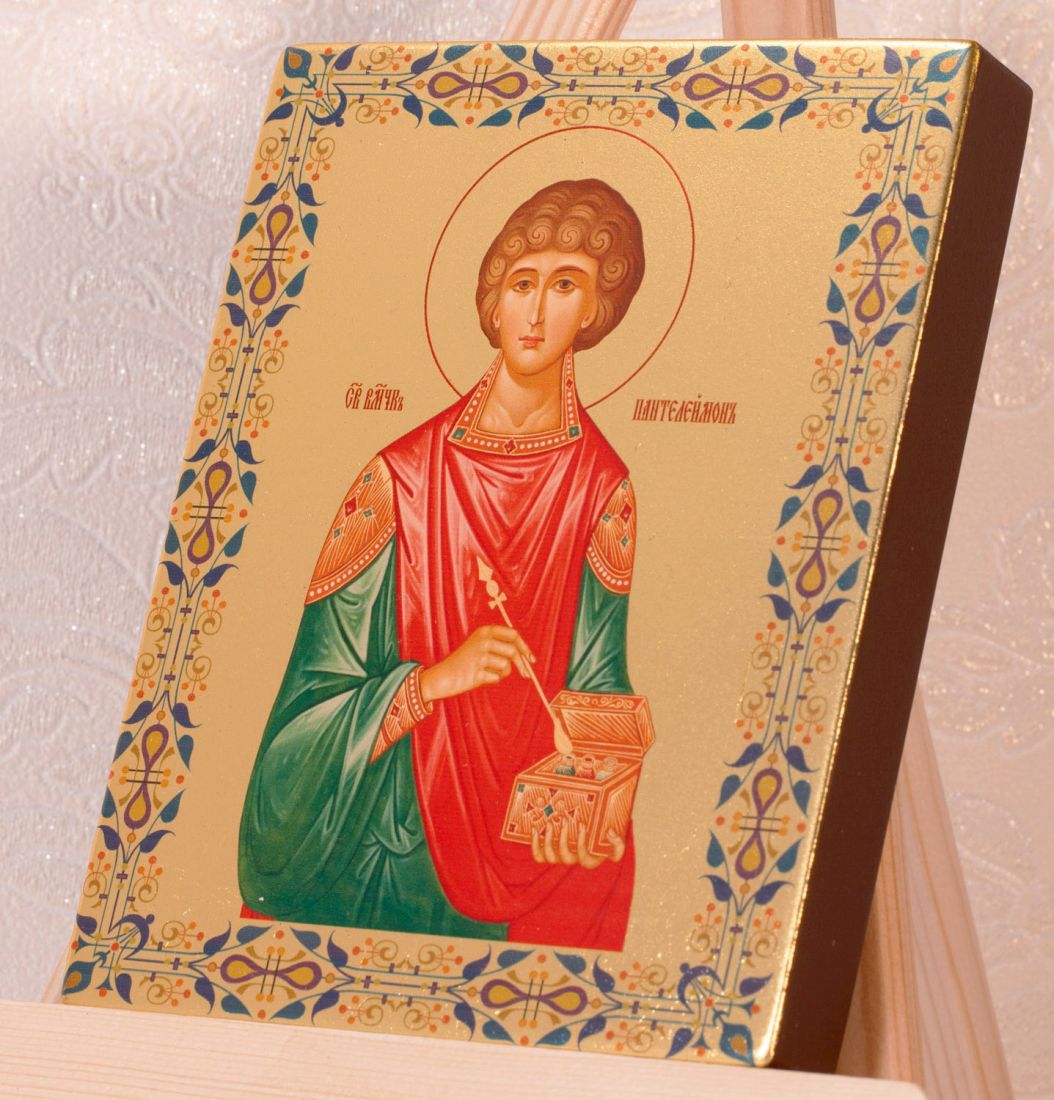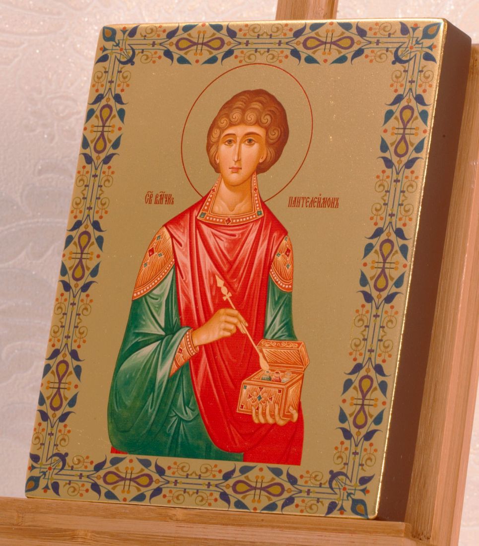 Икона пантелеймон целитель. На предварительно обработанную, специально подготовленную липовую доску наносится золочение. Далее методом прямой печати на золотую поталь (высокотехнологичный аналог сусального золота) переносится святой образ. Затем икона покрывается несколькими слоями защитного UV-лака, что защищает изображение от воздействий окружающей среды и выцветания красок (Гарантия - 50 лет!) На обратной стороне иконы имеется крепление и сертификат на изделие. Высокотехнологичное современное оборудование, используемое при производстве и применение итальянских красок премиум-класса делает качество иконы практически неотличимым от рукописного аналога. Преимуществом данной серии является так же и то, что никакие погрешности в изображении образа технологически невозможны - Вы получаете именно такую икону, которую видите на фотографии! Дополнительные характеристики икон в зависимости от размера (см): 13х16 - без ковчега, толщина доски 2 см. 17х21, 24х30 - с ковчегом (по желанию без), толщина доски 2 см. 30х40, 40х60, 60х80, 80х120 - с ковчегом (по желанию без), толщина доски 4 см, шпонки типа ласточкин хвост. Вожможно изготовление иконы по индивидуальному размеру и по индивидуальному изображению.